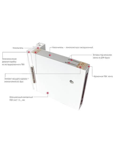 KAPELLI  Мulticolor –это дверь выполненная по типу сэндвича ,где внутренним наполнением является пенополистирол с усилением каркаса LVL брусом и ДПК брусом, облицованная компактным ПВХ листом 2.5 мм гладким либо фрезерованным.Торцы двери закрыты кромочной ПВХ лентой. Телескопическая дверная коробка выполнена из экструдированного ПВХ.В серии Мulticolor  весь ПВХ (лист, коробка, наличник ) окрашены по системе RAL специальной краской .Возможно окрашивание деталей двери в разные цвета .